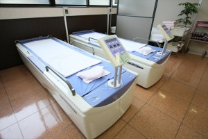 「水圧刺激」というウォーターベットタイプの全身治療システムです。 柔らかく、心地よい、「水」ならではの独特の刺激と浮遊感、血行促進などのマッサージ効果があります。たっぷり入った水と柔らかいラバーマットが患者さんへの負担を軽減し、例えば腰が曲がっている患者さまでも大丈夫です。