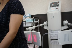 極超短波という温熱作用の波長を照射して、血流の流れをよくする治療器です。マイクロ波を患部に照射して局所の温熱効果により治療します。