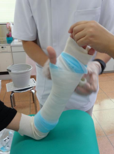 捻挫の場合、重症度に応じて、テーピング、包帯、ギプスを用いて、R・局所安静を保ちます。そして自宅では、I・冷却とE・挙上を続けていただきます。